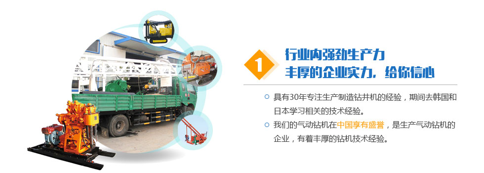 客戶共創(chuàng)雙贏。堅持科技先導、質量第一、信譽第一。讓我們用真誠的智慧共同締造事業(yè)的成功。讓我們用真誠的智慧共同締造事業(yè)的成功。希望與您的合作,能為我們的雙方共添輝煌。經(jīng)營宗旨:質量求生存,信譽樹品牌,價格贏打井設備市場,創(chuàng)新圖發(fā)展。我們將以一流的技術換取您的信賴和欣慰。公司以人為本,廣納天下人才,技術力量雄厚。公司堅持以人為本,以優(yōu)取勝,精誠服務,持續(xù)改進的質量方針和氣動鉆機服務宗旨。真誠地與氣動鉆機